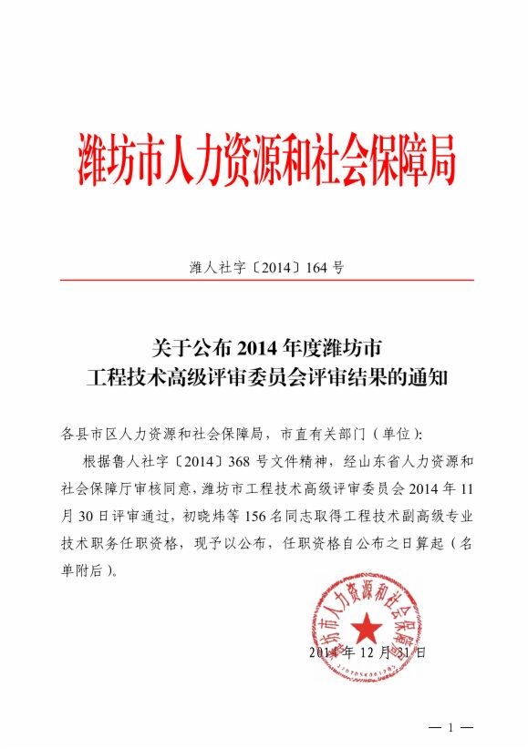 关于公布2014年度潍坊市工程技术高级评审委员会评审结果的通知.pdf